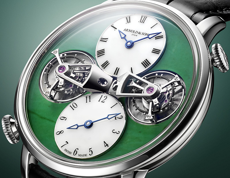 Arnold & Son is celebrating its Double Tourbillon collection with the unveiling of two unique pieces adorned with dazzling green jade and delicate white opal. The two independent tourbillons and two time zones of this rare model have taken on a new face. The result of high-calibre watchmaking execution, these models are available in either red gold or white gold.