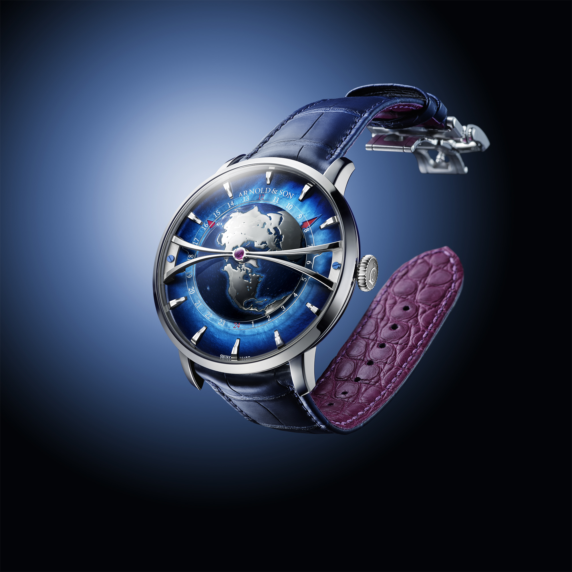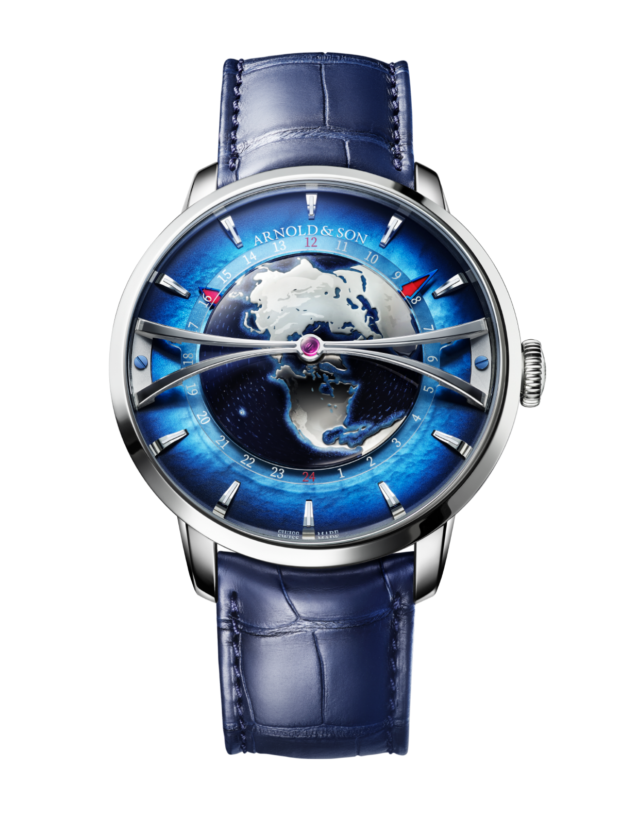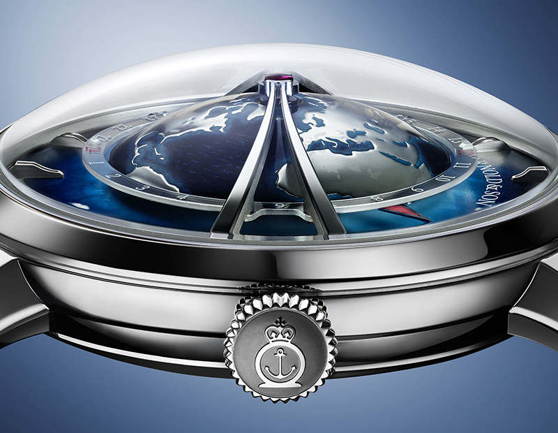 - 渐变蓝色珍珠母贝: 18k镀铑金色立体镶贴,带有Super-LumiNova夜光涂层 /// 24小时圆环: 蓝宝石镜面,带时标 /// 大陆: 镀铑、抛光,带有哑光山脉细节 /// 海洋: 手绘,蓝漆,珠光粉 /// 海岸线:手绘,蓝漆、珠光粉、Super-LumiNova夜光涂层 /// 拱桥: 18k镀铑金,侧面抛光和缎面处理