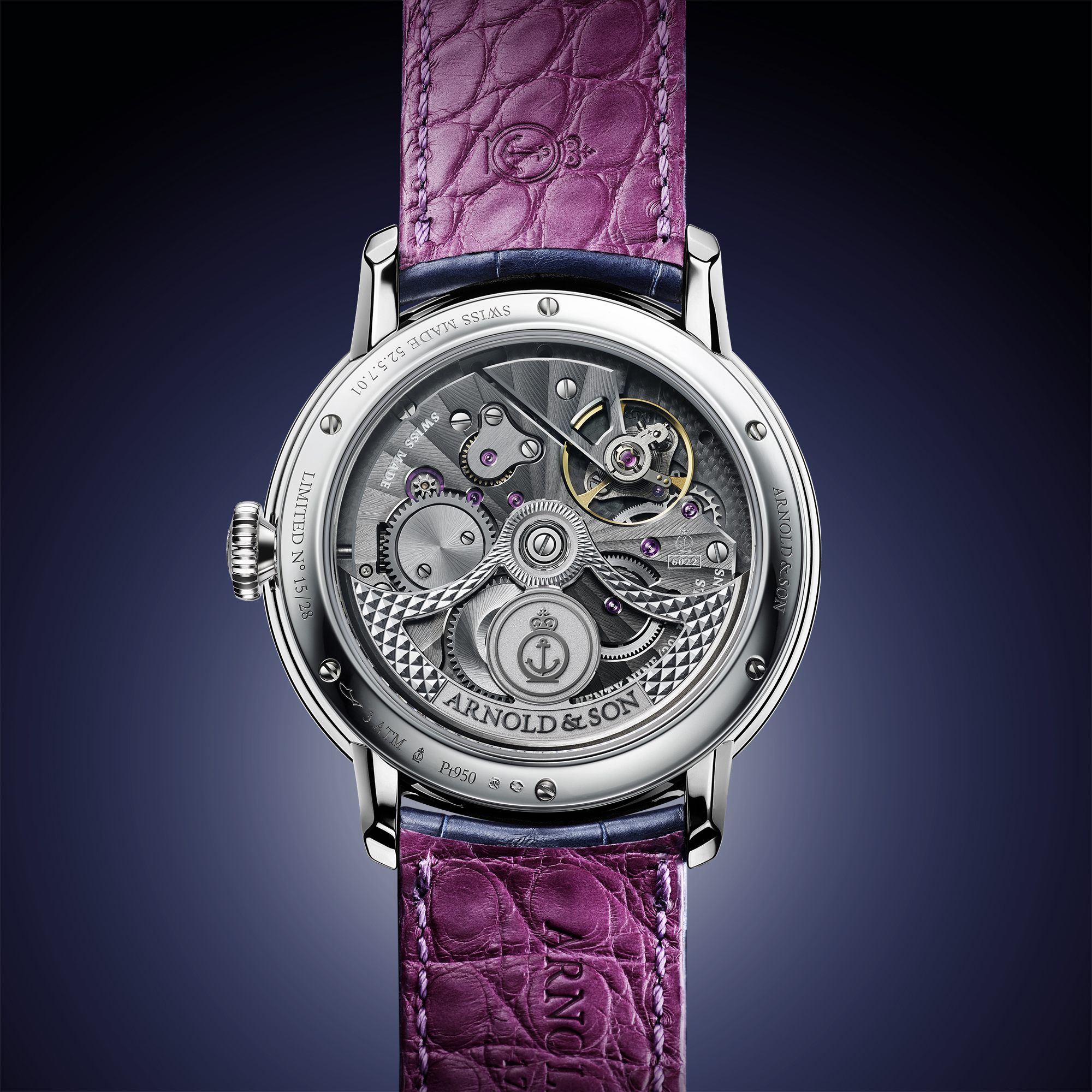 - 手工缝制蓝色鳄鱼皮,带莓粉色鳄鱼皮衬里,/// 表扣: Pt 950铂金和钛金属折叠式表扣