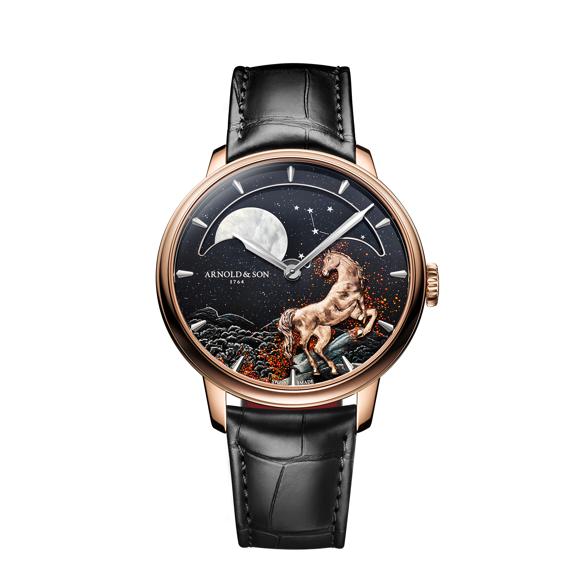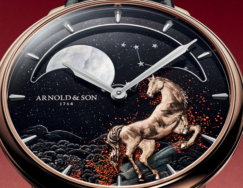 神秘、野性而炽热,Perpetual Moon 41.5 Red Gold « Year of the Horse » 腕表延续了雅诺(Arnold & Son)以中国生肖为主题的创作脉络。自 2026 至 2027 年,火马之年将引领钟表与艺术工艺爱好者的星象运势。为致敬这一充满力量的生肖符号,雅诺品牌推出 8 枚限量作品,置于 41.5 毫米红金表壳之中。高贵的骏马始终守候,而在夜幕之下,它展现出最为奔放、神秘与炽烈的性情。
